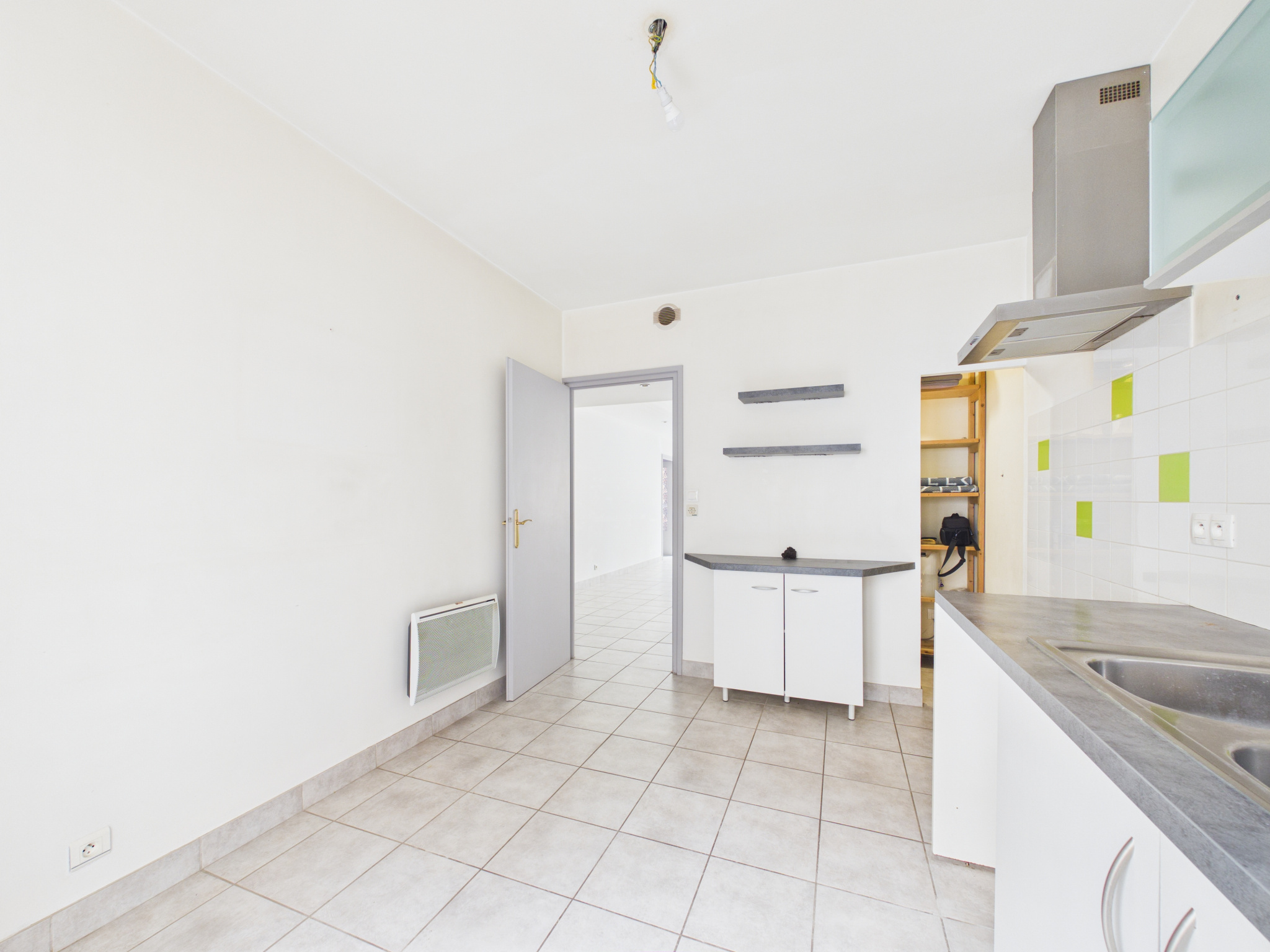 La cuisine séparée est attenante à une autre pièce, toutes les deux ouvertes sur la terrasse. Vous pourrez envisager de réunir ces deux pièces pour créer une cuisine de 20M2.