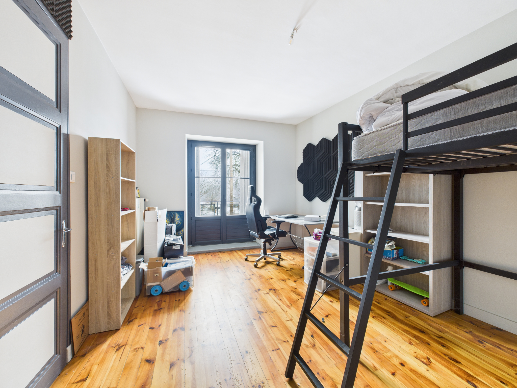 L'étage regroupe 4 grandes chambres (entre 15 et 20M2), un bureau, une pièce avec WC et Lave main dans laquelle on peut envisager la pose d'une douche.